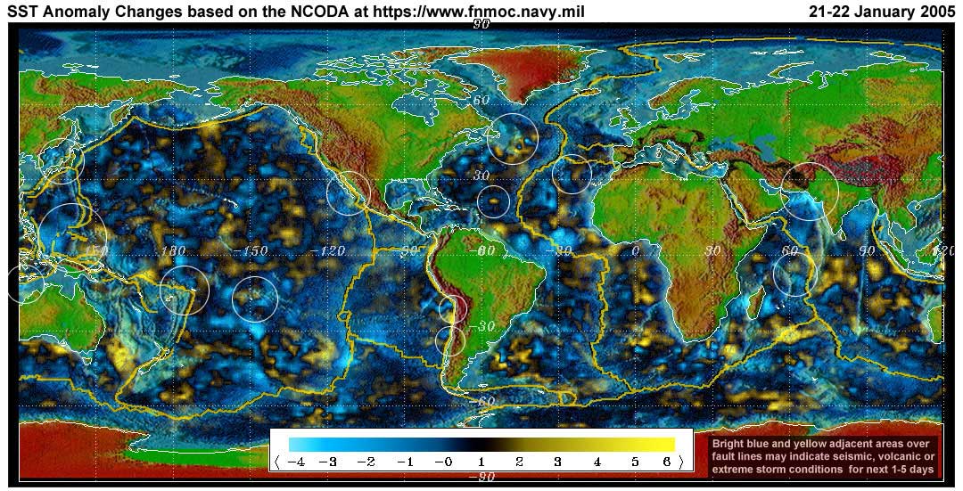 Stan's analysis shows areas of possible earthquake or volcanic activity, or extreme storm conditions for the next 1 to 5 days. Pay particular attention to areas marked by white circles. The continuous yellow line denotes plate tectonic boundaries as well as the Ring of Fire.