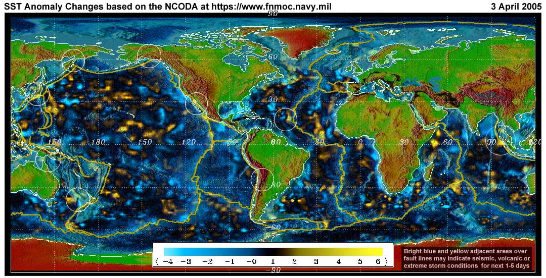 DEYO NOTES: For earthquake maps, see the USGS "shake maps" (click anywhere on the global map for a closer view). For quakes USGS may not list, go to the European-Mediterranean Seismological Center's map and scroll to the bottom of the page for a global view. You can compare these maps for the next 5 days to Stan's NCODA maps, to see the hits of his seismic target zones (white circles).